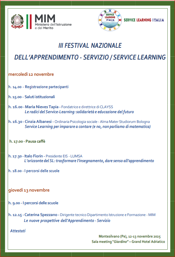 Il III Festival nazionale del Service – Learning si terrà dal 12 al 13 novembre 2025 presso il Grand Hotel Adriatico di Montesilvano.