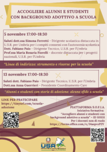 Nella nota il programma, il link per partecipare e le informazioni per iscriversi entro il 4 novembre p.v. al corso “Accogliere alunni e studenti con background adottivo a scuola” su piattaforma S.O.F.I.A. per il riconoscimento di cinque ore di formazione.