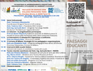 Invito per la partecipazione on line all’evento “Ecosistemi di apprendimento: progettare, organizzare e utilizzare gli ambienti a scuola” INDIRE – USR UMBRIA con ANCI e EFT Umbria. Secondo incontro il 28-01-2026 presso l’Auditorium di Palazzo Primavera di Terni in Via Giordano Bruno, 3, 05100 Terni TR.