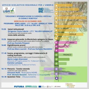 Facendo riferimento alla Nota AAOODRUM n.  20193 del 31-10-2025 allegata relativa ai gemellaggi del Progetto “Creazione e sperimentazione Curricoli verticali di coding e robotica” USR per l’Umbria INDIRE si comunica che il primo gemellaggio previsto per il terzo anno di sperimentazione e ricerca è stato pianificato e avrà luogo il giorno 03-12-2025 presso la scuola ospitante I.T.T. Allievi Sangallo di Terni dalle ore 15:30 alle ore 18:30.